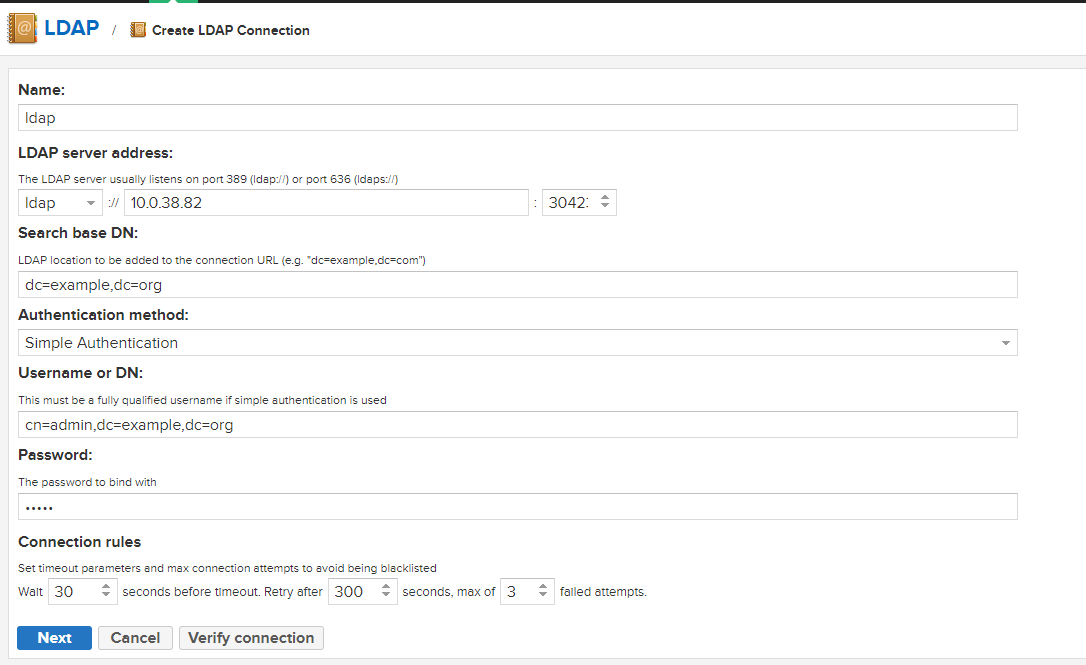 配置LDAP连接,点击Verify Connection。连接成功后提示Connection to LDAP server verified: ldap://xx.xx.xx.xx:xxxx