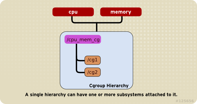一个hierarchy可以附加一个或者多个subsystem(同时参照规则2)。例如cpu子系统和memory子系统(或任意数量的子系统)可以附加到单个层次结构。