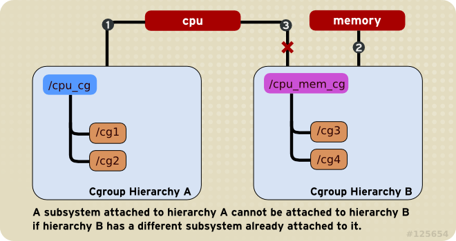 任何single subsystem(例如cpu)都不能附加到多个hierarchy上。如果第二个hierarchy没有其他的subsystem,那么就可以依附,即可以存在两个都仅有cpu依附的hierarchy;如果第二个hierarchy上依附了其他的subsystem,那么就不能依附。如图,图中的编号表示子系统所附的时间序列,因为 Hierarchy B依附了其他系统,所以cpu子系统就不能依附了。