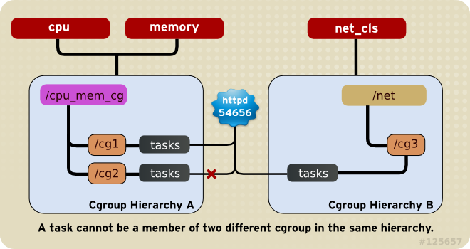 如图,如果cpu和内存子系统连接到名为cpu_mem_cg的hierarchy中,而net_cls子系统连接到名为net的hierarchy中,那么httpd进程可以是cpu_mem_cg中任何一个cgroup的成员,也可以是net中的任何一个cgroup的成员,但其不能同时存在于cpu_mem_cg中的两个cgroup中。