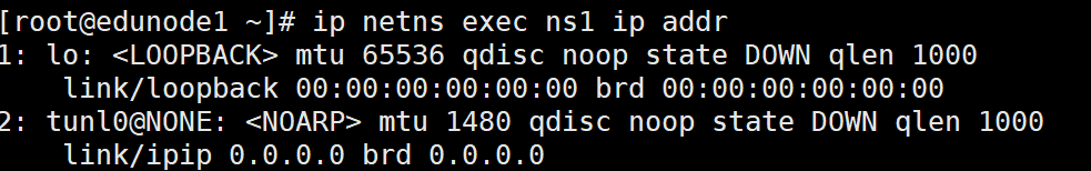 - 查看ns1中的网络,通过ip netns exec执行在ns中执行响应命令